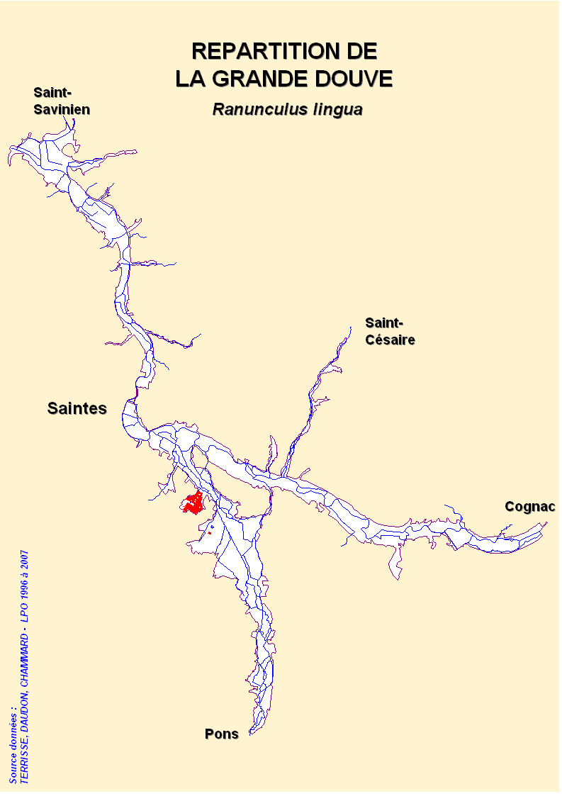 La Grande Douve n’a été observée jusqu’ici que dans le val de Seugne (marais des Breuils) et, surtout, le marais de l’Anglade qui constitue son bastion local (plusieurs petites populations). Les effectifs dans chaque station sont en général faibles : quelques individus à quelques dizaines, rarement plus de 100.