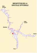 De fait, en vallée de la Charente, sa distribution paraît relativement complémentaire de la celle de la Renoncule à feuilles d’Ophioglosse : si cette dernière connaît son optimum en aval de St Savinien, la Gratiole est surtout fréquente en amont de Saintes, l’espace compris entre ces 2 villes constituant une zone intermédiaire où les 2 espèces peuvent se rencontrer ensemble dans les mêmes parcelles. Quelques stations sporadiques existent aussi en val de Seugne, dans le marais de l’Anglade, au niveau d’anciennes mares entretenues pour la chasse au gibier d’eau.