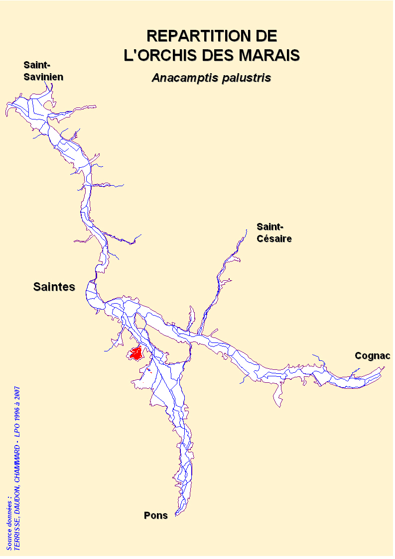 L’espèce n’a été observée que sur les sols tourbeux du val de Seugne et, notamment, en marais de l’Anglade où elle est dispersée et présente sous forme de pieds isolés ou de micro-peuplements partout où la roselière à Marisque est suffisamment ouverte : clairières créées pour la chasse au gibier d’eau, layons d’accès. Elle manque en revanche totalement sur les sols alluviaux des rives de la Charente.