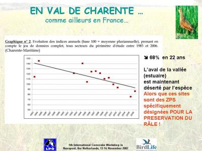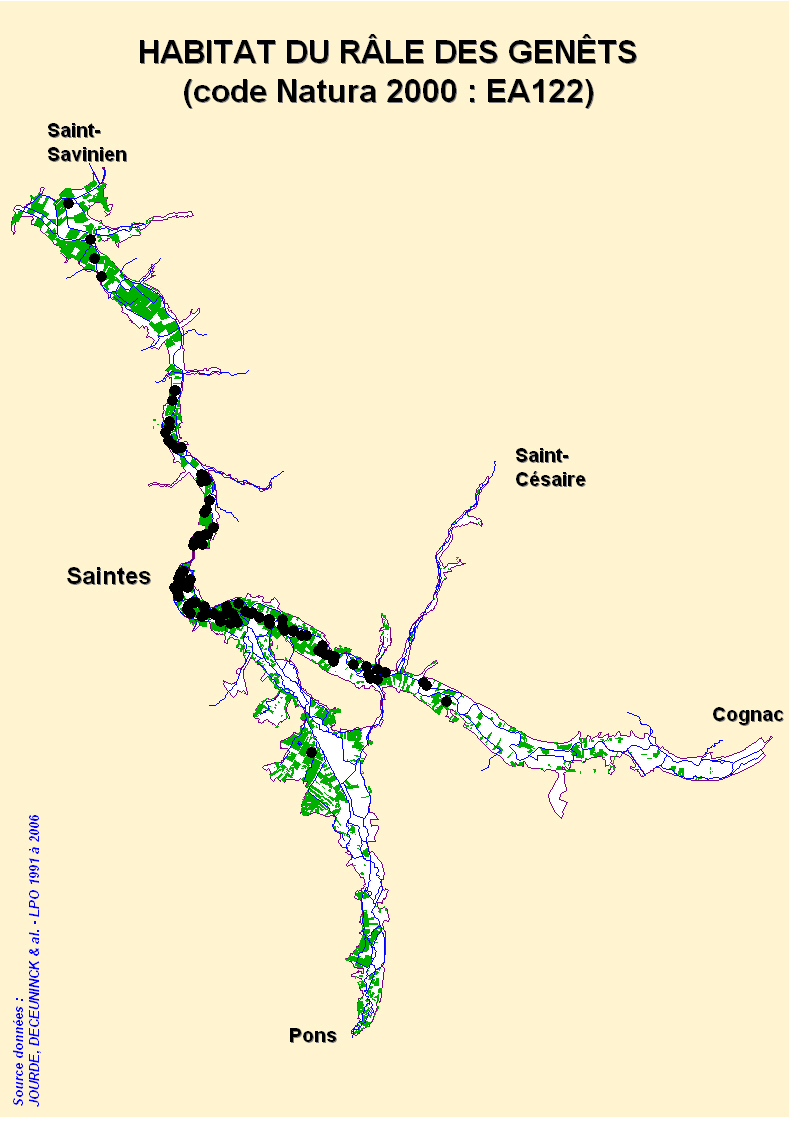 Potentiellement présent dans la totalité des prairies alluviales du site. Depuis quatre ans, déclin marqué et concentration de la population dans les prairies en amont immédiat de Saintes. Seulement 30 mâles ont été dénombrés sur le site du Val de Charente et Seugnes en 2006.