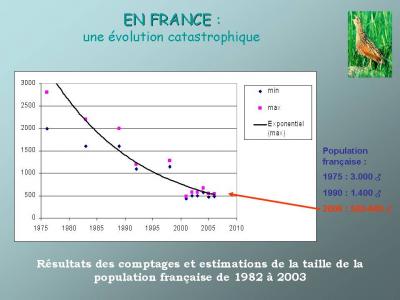Dans les prairies de fauche restantes, l'évolution des matériels agricoles et de la conduite des exploitations entraîne une fenaison plus précoce en saison qui est fatale au râle : même si les adultes - qui s'enfuient "à pattes" sans s'envoler - sont le plus souvent épargnés, les oeufs et les poussins sont broyés. Les populations mondiales s'effondrent, laissant craindre la disparition de l'espèce à moyen terme.