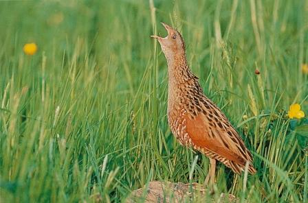 Cliquez sur l'image ci-dessous pour entendre la "douce mélopée" (!) nocturne du Râle des genêts. Son chant répétitif "crex crex ... crex crex... crex crex..." (d'où vient son nom latin) rappelle un crissement d'insecte. Enregistrement privé ; copyright : Philippe JOURDE.