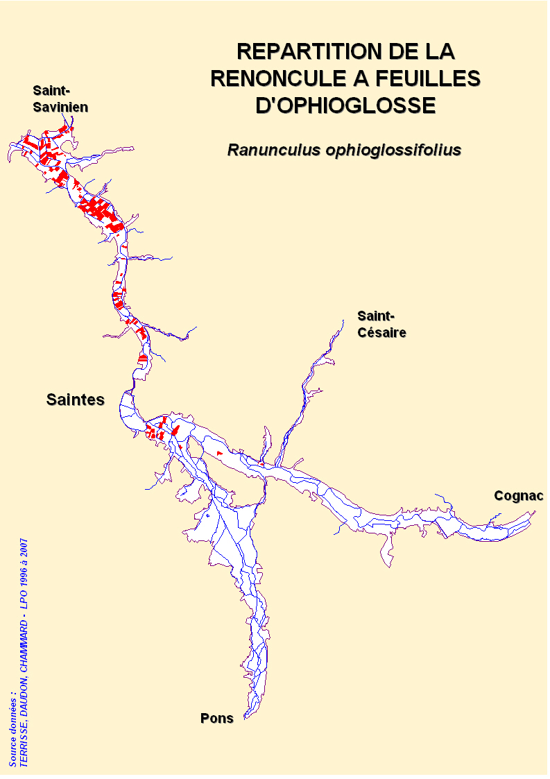 L’espèce est présente essentiellement dans les prairies alluviales situées entre Saintes et Saint-Savinien, devenant de plus en plus fréquente et abondante vers l’aval : entre ces 2 villes, l’espèce a été recensée au cours d’une étude menée en 2002 dans 153 parcelles (soit 36%), avec des effectifs dépassant le millier de pieds dans 15 parcelles.